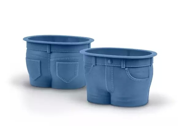 這款硅膠制品顯然看起來也有一種不同三樣的感覺,這是一個蛋糕模具,上面黃色的部分就是蛋糕,下面藍色的那部分才是硅膠,就連顏色都跟人的牛仔褲差不多了,根本無法一下子反應過來。