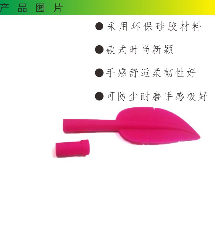 13712483599羽毛形狀硅膠筆套,是硅膠制品中的一種,由東莞帝博硅膠制品廠家創(chuàng)意研發(fā),在筆套內(nèi)套上直徑為6cm左右大的筆芯即可使用,材料選用環(huán)保硅膠高溫成型,無(wú)毒無(wú)味,產(chǎn)品柔軟有彈性,而且非常的有手感,書(shū)寫更華麗。適合很多場(chǎng)合使用,搭配鮮艷的顏色更是讓這款產(chǎn)品如虎添翼,找不出一點(diǎn)瑕疵。